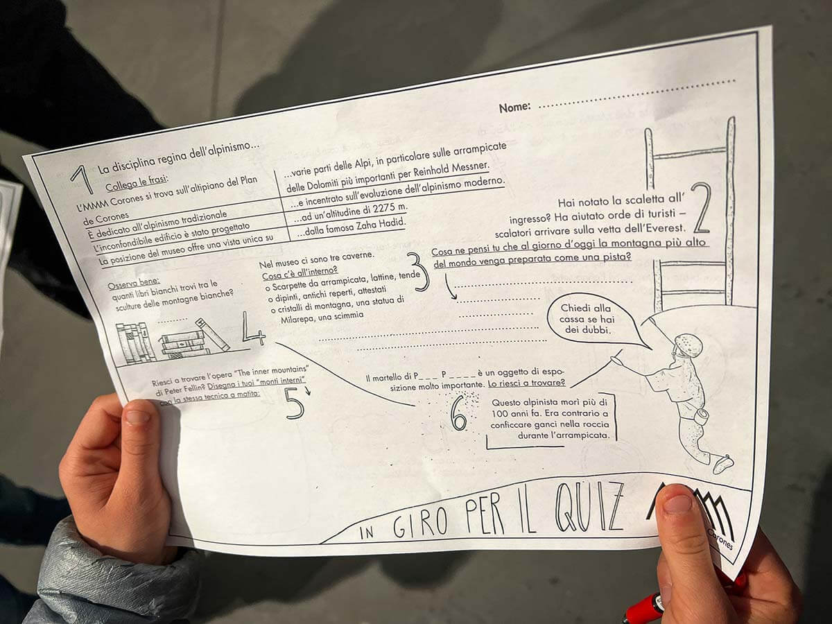 Il nostro viaggio tra cultura e natura in Trentino-Alto Adige con i bambini è iniziato dal Messner Mountain Museum di Plan de Corones. Il Messner Mountain Museum di Corones è un edificio incastonato nella montagna a 2275 m con delle viste strepitose sulle valli, progettato da Zaha Hadid. A ogni bambino che visita il museo viene dato un quiz gioco “In giro per il quiz” che devono risolvere durante la visita, un’ottima soluzione per interessarli alla visita.