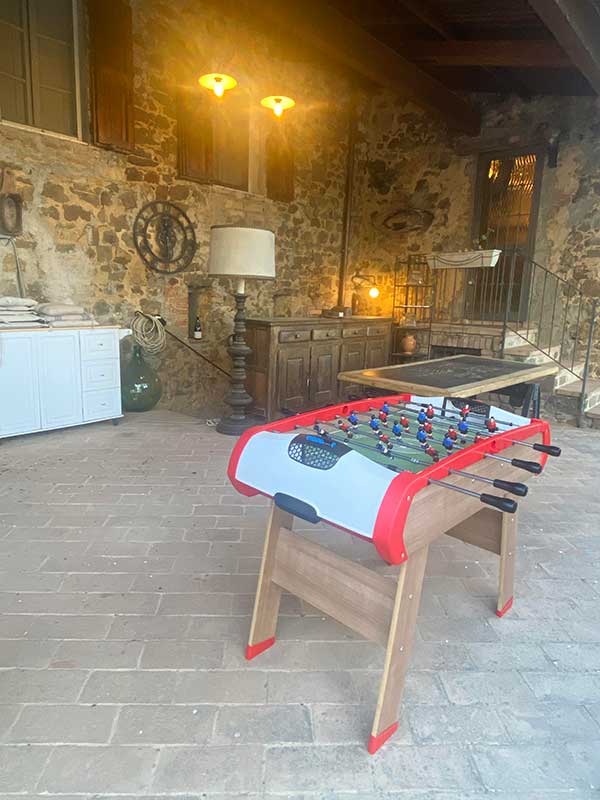 L’agriturismo è invece un casale tipicamente toscano, con tante lucine, un bellissimo giardino, un biliardino e un parco giochi in legno per i bambini con tanto di tappeto elastico. Qui i bambini possono giocare liberi e al sicuro.