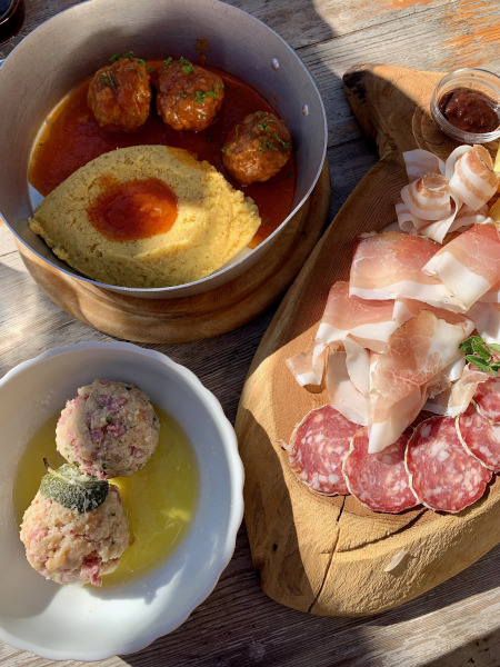 Vista la giornata soleggiata e abbastanza calda, nonostante sia autunno, abbiamo pranzato all’esterno. Tavoli con panche in legno sotto un grande pergolato molto suggestivo con vista spettacolare sul bosco con i tipici colori autunnali. Il pranzo tipico trentino a base di tortel di patate accompagnato da salumi e formaggi locali e canederli cucinato da Nicoletta era davvero squisito! Mia ha divorato tantissimi tortei e Clelia ghiottissima di salame, noi abbiamo gustato i veri sapori della cucina casalinga accompagnati da ottimo vino.