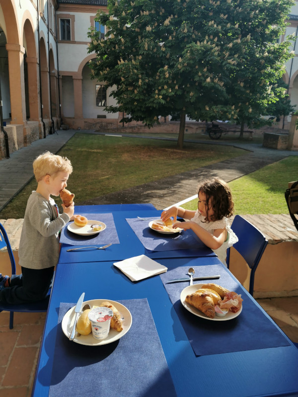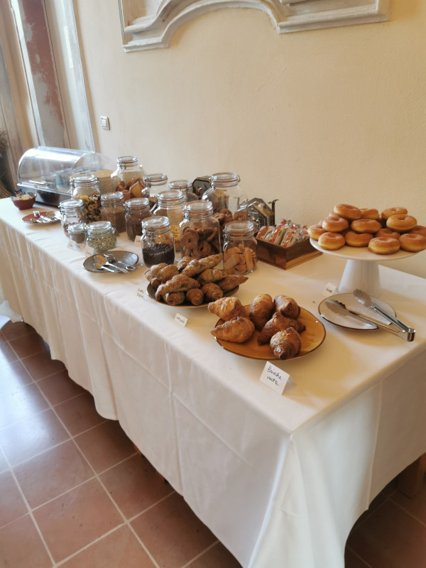 La colazione è compresa nella tariffa, è a buffet, molto varia, con proposte dolci e salate. Si può scegliere di sedersi all’interno nel grande tavolo o appunto fuori e godersi la tranquillità del chiostro.
