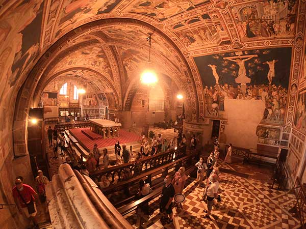 Lo sguardo viene rapito dagli affreschi di Giotto, Cimabue e Lorenzetti. Sembra incredibile che in quella stessa chiesa dove eravamo noi ci abbia lavorato Giotto. La tomba di Francesco è ben protetta ma si può vedere la semplicità del sepolcro in pietra, semplice e povero come la vita che ha condotto. Saliamo nella parte nuova della basilica, anch’essa splendida, più ricca, un omaggio sicuramente al santo. Quando riconquistiamo la luce il giardino davanti la basilica sembra ancora più bello.