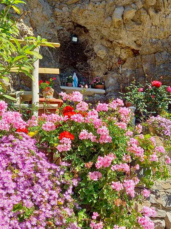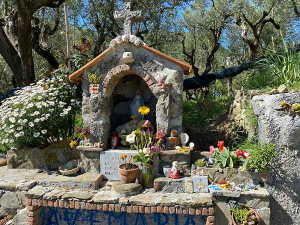 Si supera il bivio con l’alta via dei monti Lattari (sentiero 300) che conduce alla sella di Monte San Costanzo e si continua più o meno in quota per circa 1 km. Sul percorso si incontra Villa Rosa dove soggiornò Norman Douglas e più davanti ad una edicola votiva incassata nella roccia.