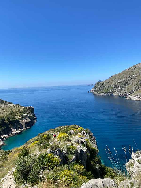 Il panorama è da favola: a destra, Punta Campanella e Capri con i suoi Faraglioni; a sinistra, il Golfo di Salerno fino a Punta Licosa, con la Costiera Amalfitana e le isole; al centro, la Baia di Ieranto.
