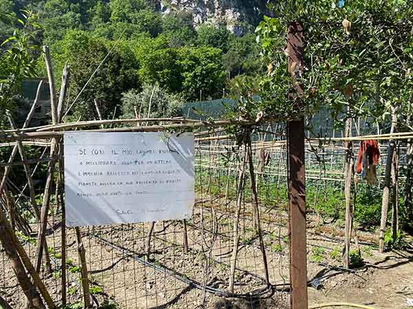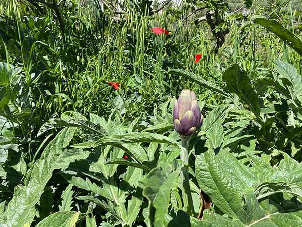 Il sentiero è profumatissimo, incontriamo fiori, campi di carciofi, uliveti.