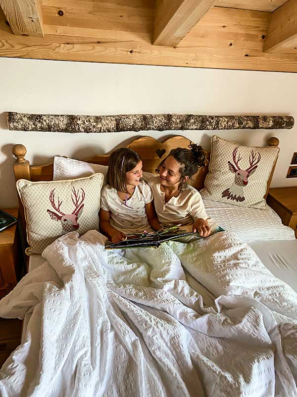 Ma la vera sorpresa sono state le stanze. Quando siamo saliti nelle nostre stanze, la vera sorpresa. Abbiamo scelto due camere comunicanti, ognuna con letto matrimoniale ( ma volendo ogni suite ha 4 posti letto: letto matrimoniale + divano letto) . Tutte le camere sono purificate con tecnologia all’ozono, sono ampie e spaziose e l’arredamento, tutto in legno di abete, larice e cirmolo, è curato nei dettagli.