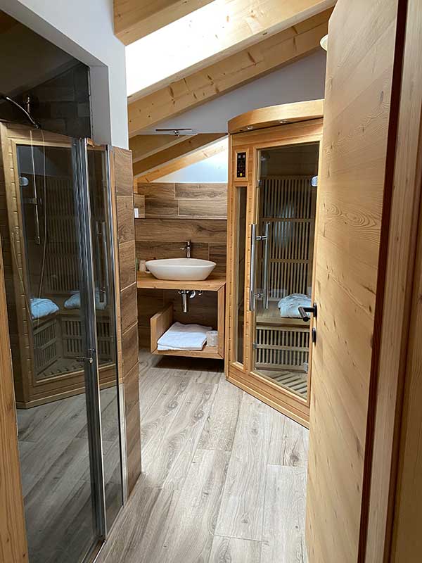Ma il valore aggiunto delle stanze sono il balconcino panoramico sulle montagne e la sauna a infrarossi + doccia idromassaggio in camera.