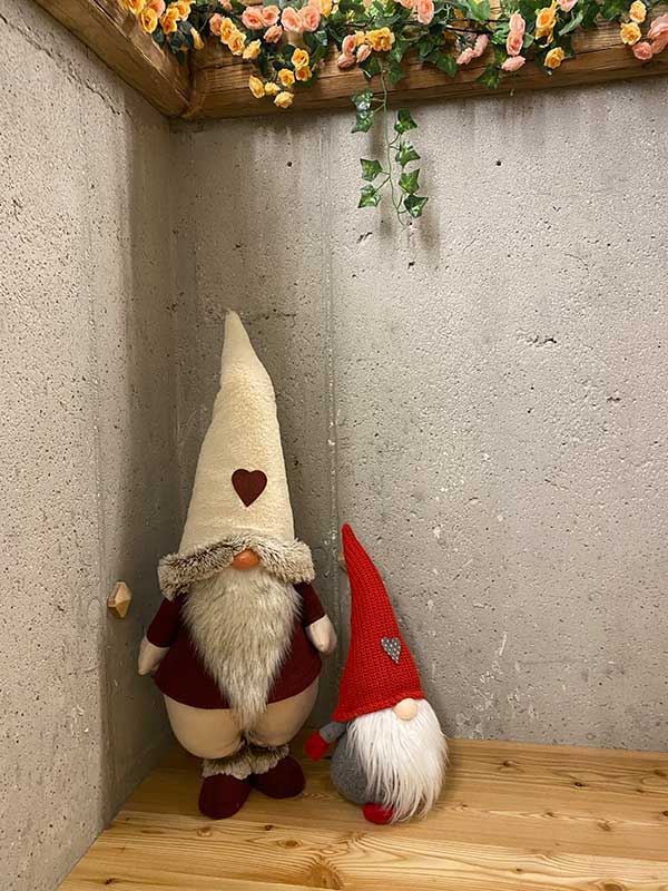 Al pianterreno c’è anche un bagno con fasciatoio. Grande attenzione a tutte le norme igieniche e sarà un dettaglio, ma l’igienizzante delle mani profuma di pino ed è meraviglioso. Sulle scale si intravedono piccoli elfi e c’è un antico (e forse magico) registratore di cassa.