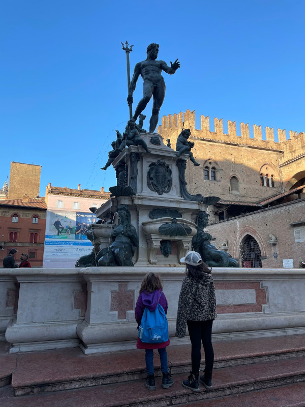 Il nostro itinerario a Bologna è partito dalla stazione centrale, dove ci siamo fermati a contemplare la lapide dedicata alle vittime del strage del 2 Agosto. Poi abbiamo proseguito con una passeggiata sotto i famosi portici, patrimonio dell’umanità dell’Unesco, per arrivare davanti alla fontana del Nettuno che si apre verso piazza Maggiore con la facciata di San Petronio ed i palazzi storici che la circondano… che grande emozione!