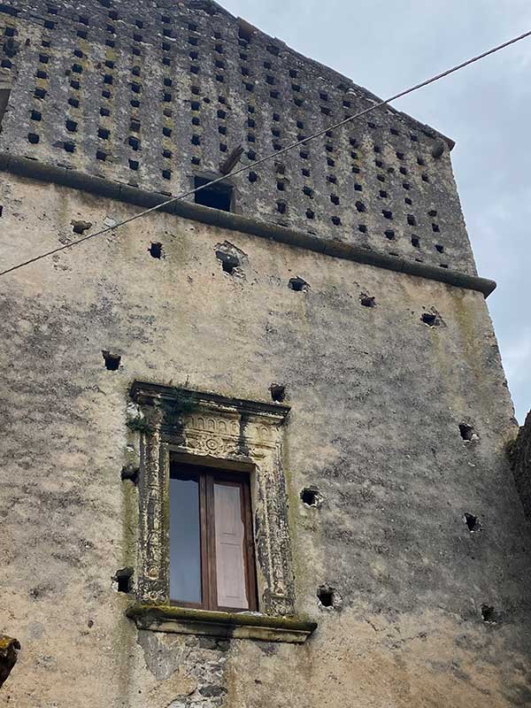 Tutt’intorno tante altre casette l’una vicina all’altra, come a sorreggersi e a proteggersi. Noi ci siamo arrivati a prima mattina, con la nebbia ed è stato come ritrovarsi in una dimensione parallela, senza tempo, con i bambini che correvano liberi tra vecchi fiaschi di olio e vino e noi con il naso all’insù ammirati dagli antichi fregi.