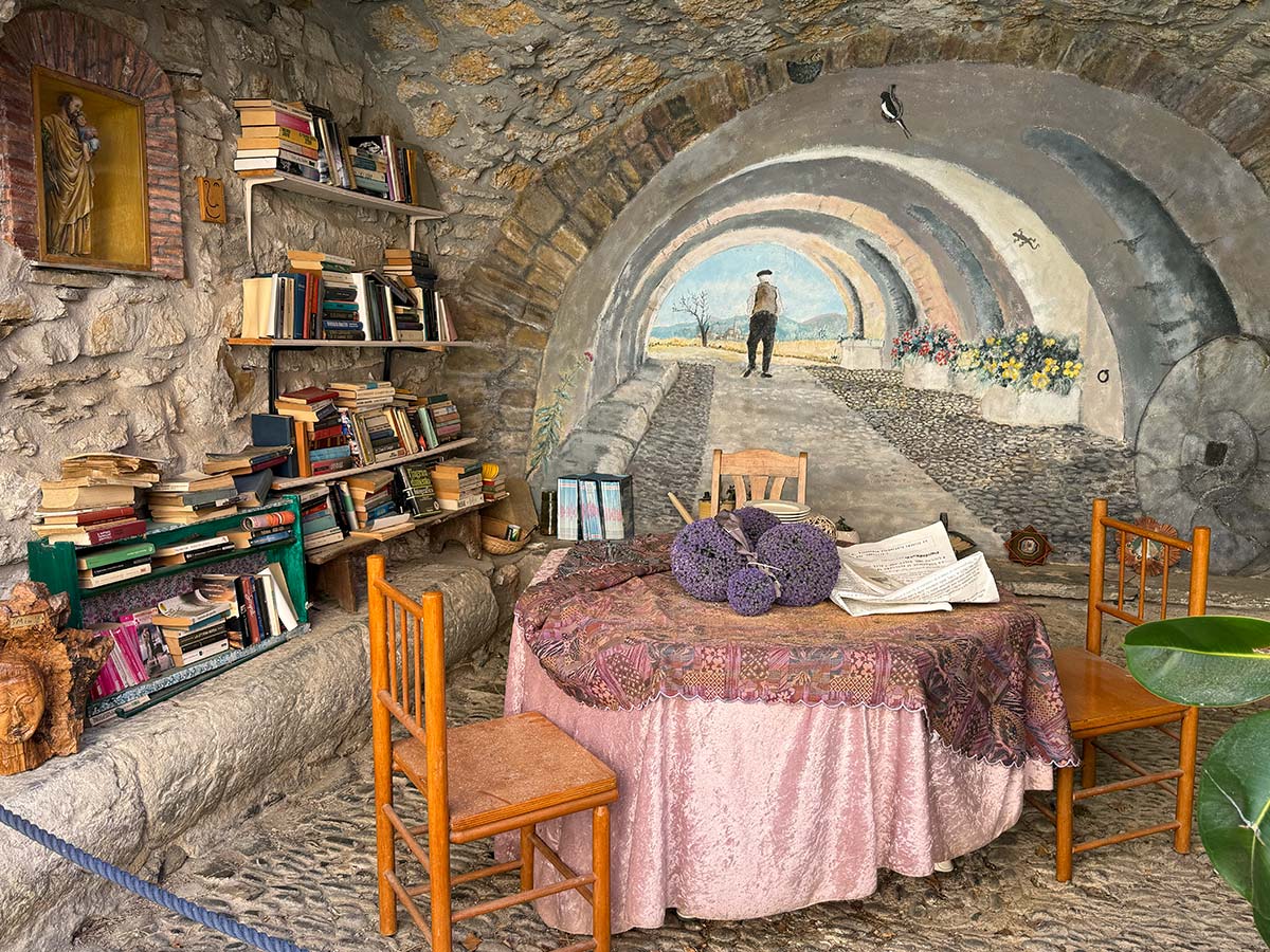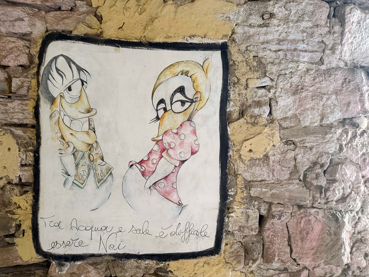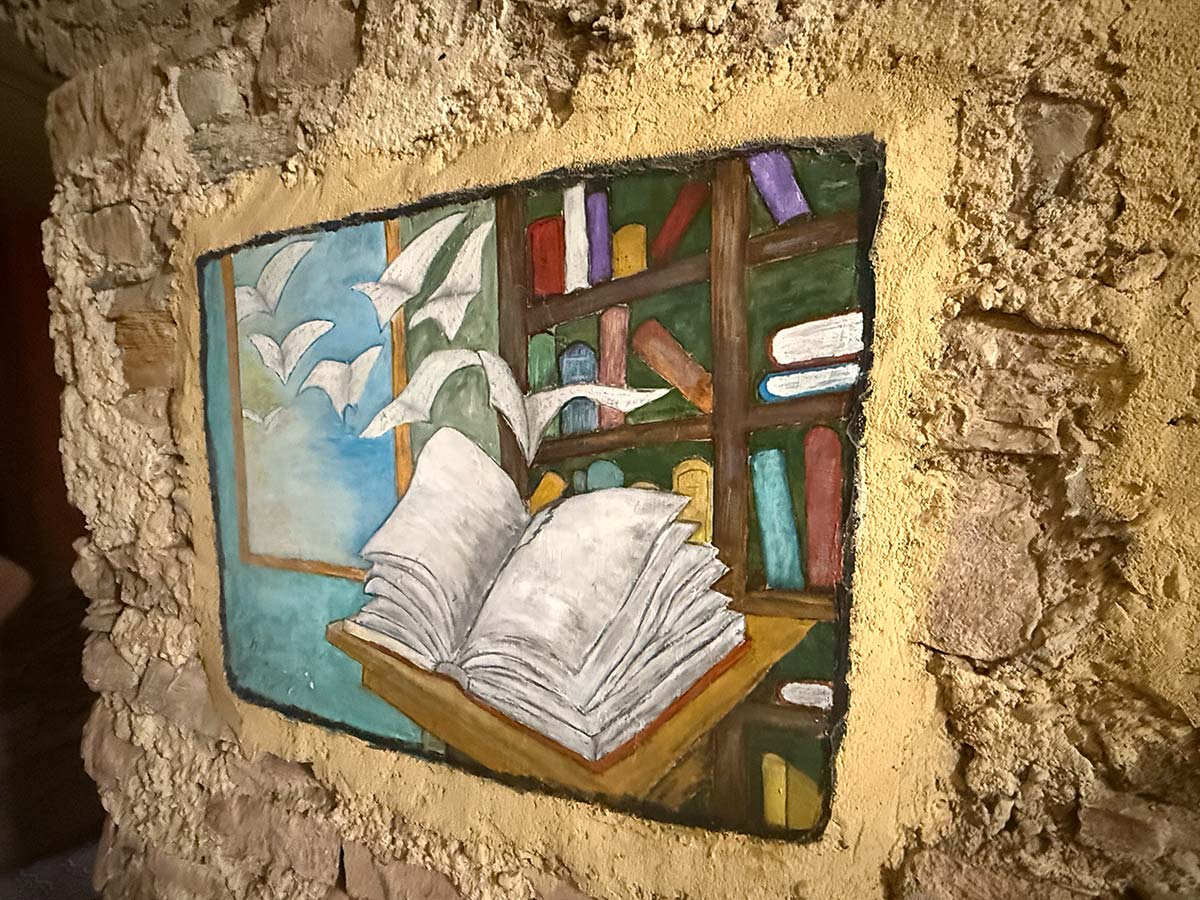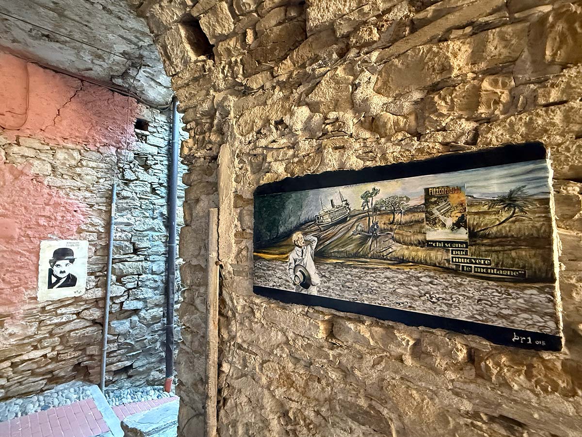 I muri dei caruggi parlano di cinema, musica, letteratura: Fellini, De André, Pinocchio, Arancia Meccanica, ma anche il Signore degli Anelli. Sotto una casa rosa, due nicchie con murales in trompe-l’œil custodiscono una libreria di scambio: arte e lettura, insieme.
