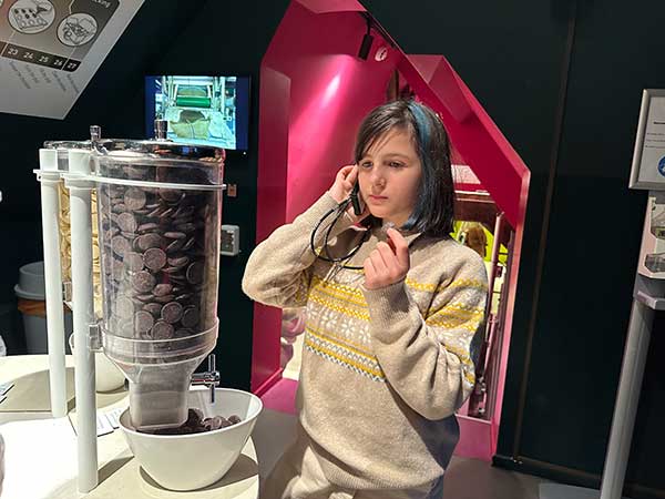 All’entrata vi danno un’audioguida a forma di barretta di cioccolata e inizia un viaggio nella storia del cioccolato, con postazioni interattive per i bambini, giochi, video….degustazione gratuita e dimostarzione dal vivo con assaggio di come si preparano le praline.