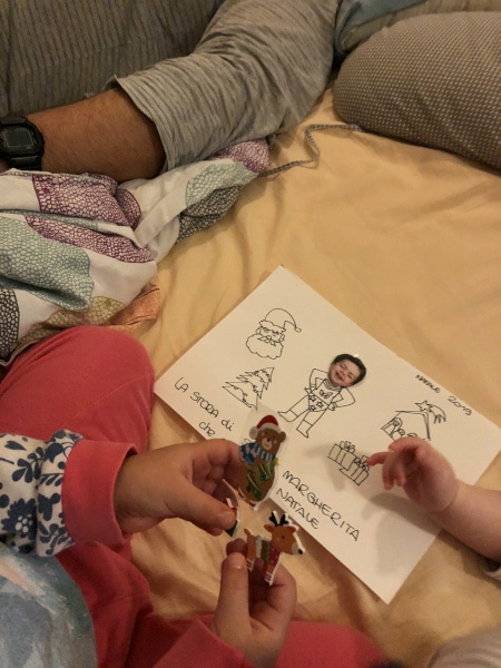 Ho preparato 24 tavole, alcune raffiguranti episodi della vita di Margherita e altre legate a lei e il Natale. All’inizio ci sono io incinta, c’è la sua nascita e altre fasi importanti della sua crescita. Ci sono le sue passioni e le cose che ha imparato a fare: lei vestita da dottoressa che cura i peluche, oppure che cucina insieme alle bisnonne e sta nell’orto con la nonna. Nelle scenette più natalizie invece scrive la letterina o prepara l’albero.