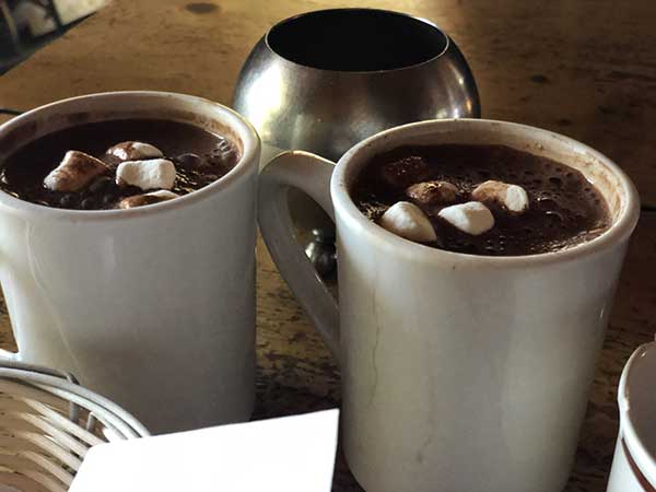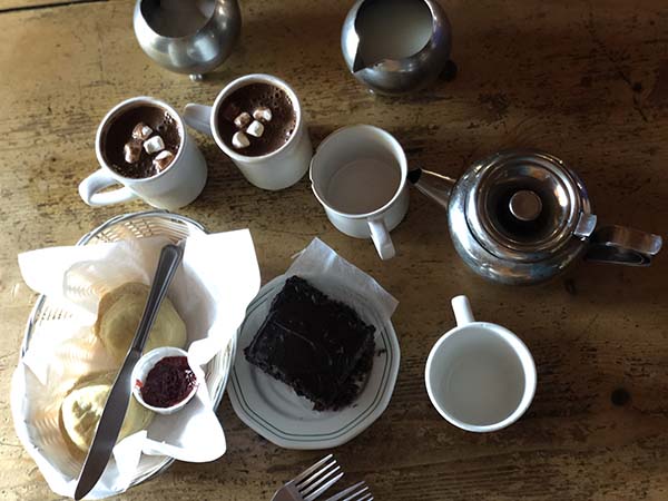 Arrivati alla tea house, tutta in legno, ci sediamo vicino al grande camino e ci riscaldiamo subito: Giulia e Francesco ordinano cioccolata e torta al cioccolato, Enrico ed io tè verde al ginger e biscotti con burro e marmellata (costo circa 30 dollari canadesi, poco più di 20 euro).