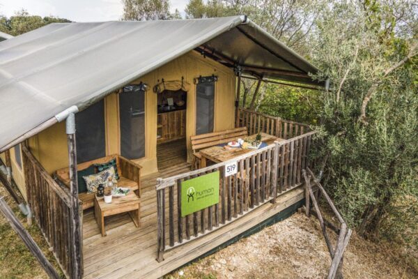 Se invece preferite un’abitazione con bagno interno potete scegliere una Lodgetent, una via di mezzo tra una tenda ecologica e una casa mobile. Ha camera da letto, veranda super accessoriata con tavolo, sedie, lettini, ombrelloni e barbecue.