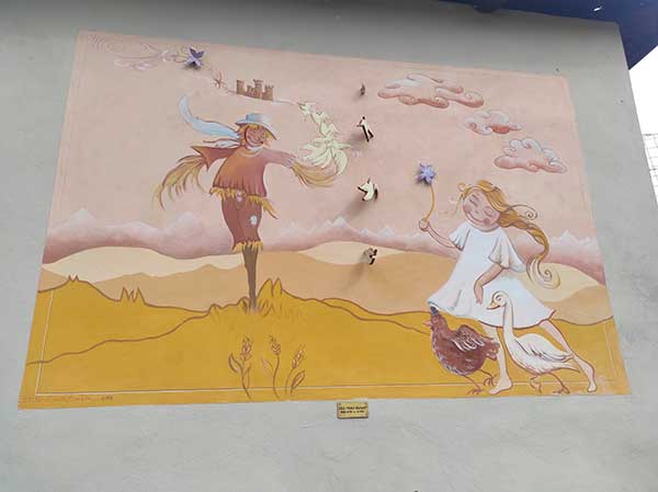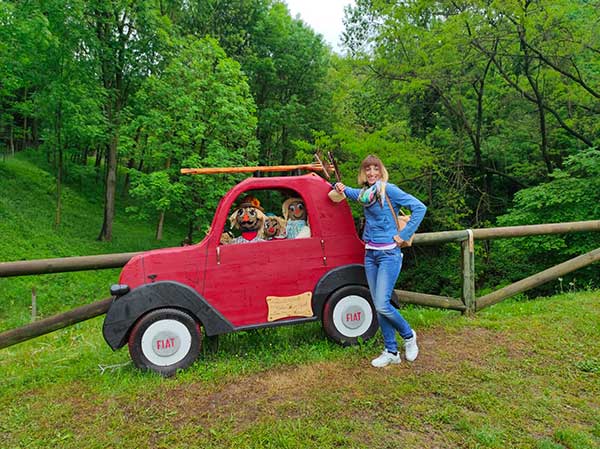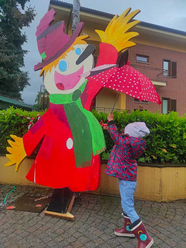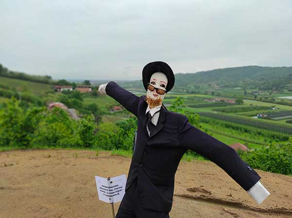 Arrivati abbiamo lasciato la macchina nel piccolo parcheggio all’inizio del paese, prima del ponte, e ci siamo incamminati verso il campanile del Paese. Già dai primi passi ci siamo accorti di quanto questa tradizione sia sentita: ogni casa, ogni famiglia, ogni associazione, scuola o ente presente sul territorio ha lasciato il suo contributo con uno spaventapasseri. Sono centinaia: piccoli, grandi, di paglia, di ferro, che prendono il sole, fanno i dj, vanno in vacanza in macchina con il proprio cane, giocano a calcetto o ti salutano.