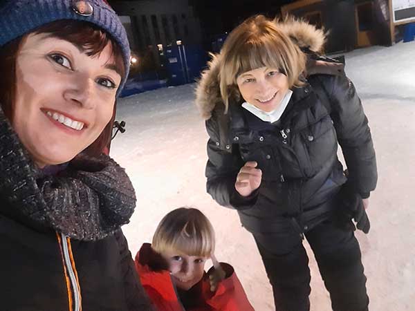 Appuntamento alle 19 alla seggiovia del Campo Smith, accesa e illuminata per l’occasione, veniamo forniti di biglietto per salita e discesa al Pian del Sole, a 1500 mt di altitudine. Le sedute sono da 4 posti (noi eravamo i soliti 3 più la nonna), molto comode e portano in pochi minuti sulla cima del monte Colomion.