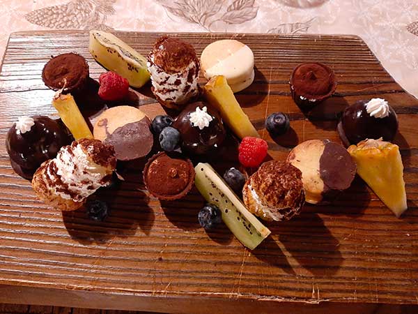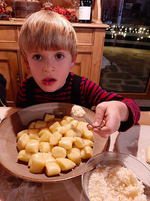 Salumi, formaggi, polenta, raclette, gnocchi di patate rosse, un pan d’epices che merita una menzione d’onore, insomma il tripudio di tutto ciò che la cucina montana può offrire concentrato in una serata. Tutto di eccellente qualità, così come impeccabile e cordiale è stato il servizio, attento alle esigenze dei più piccoli. All’arrivo del tagliere di dolci eravamo satolli come degli antichi romani sul triclivio ma non ci siamo tirati indietro, sperando di smaltire tutto una corsetta notturna giocando a palle di neve.