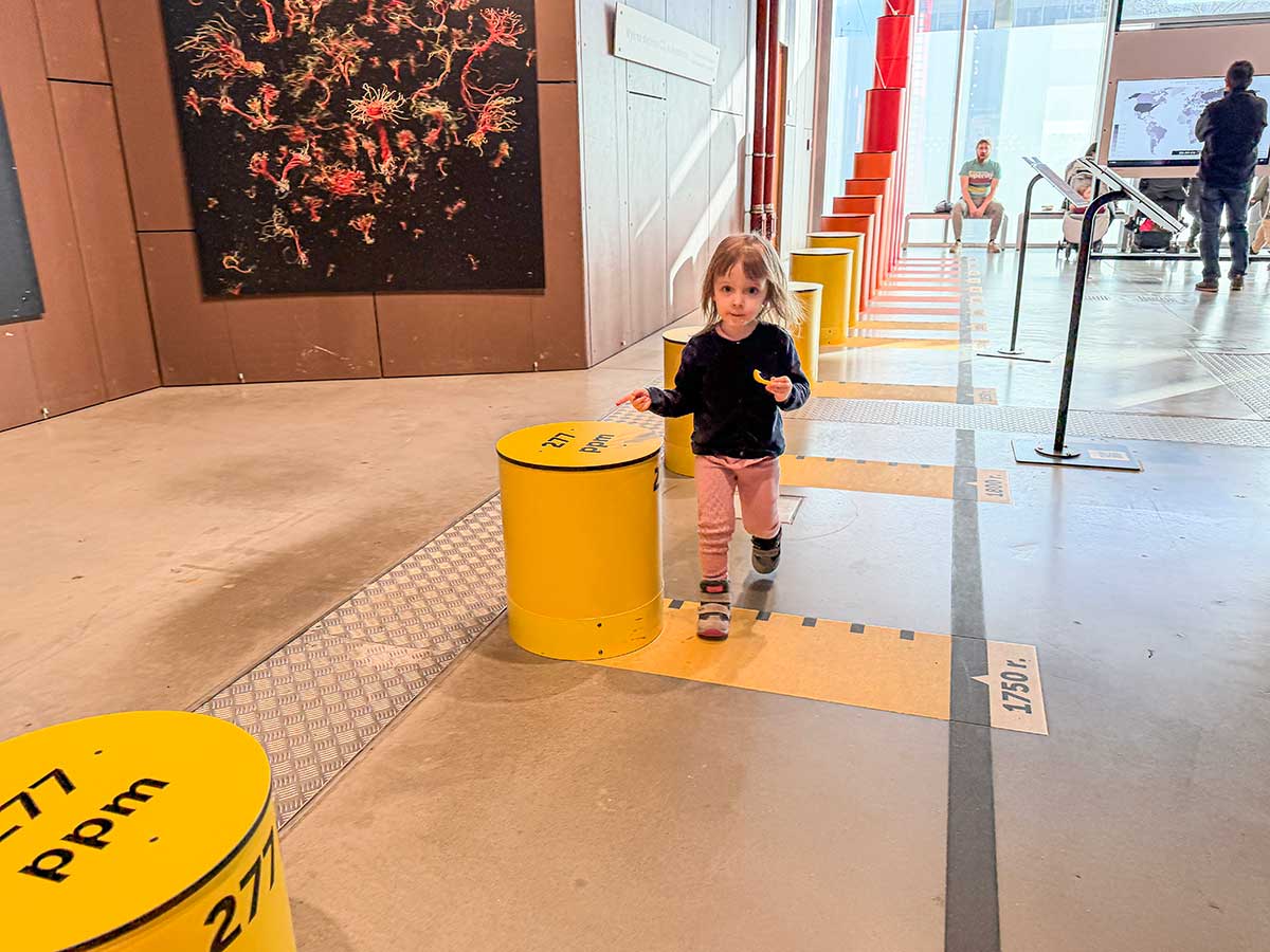 Le installazioni mostrano in modo concreto il tema delle emissioni di anidride carbonica, dell’inquinamento e dell’impatto delle scelte quotidiane. È una sezione molto efficace per bambini, ragazzi e adulti.