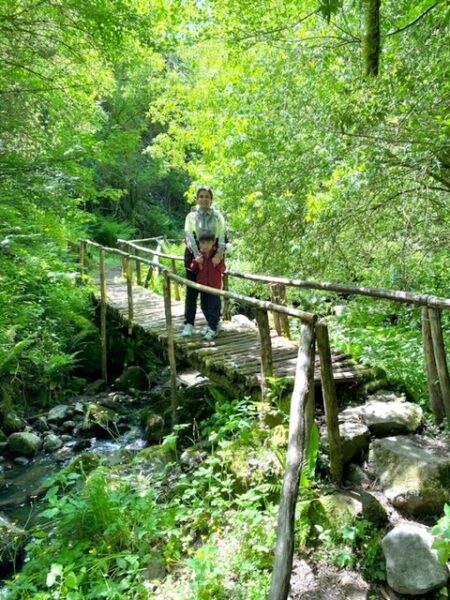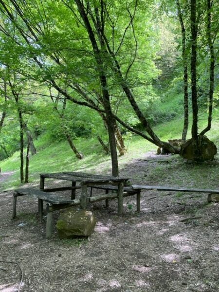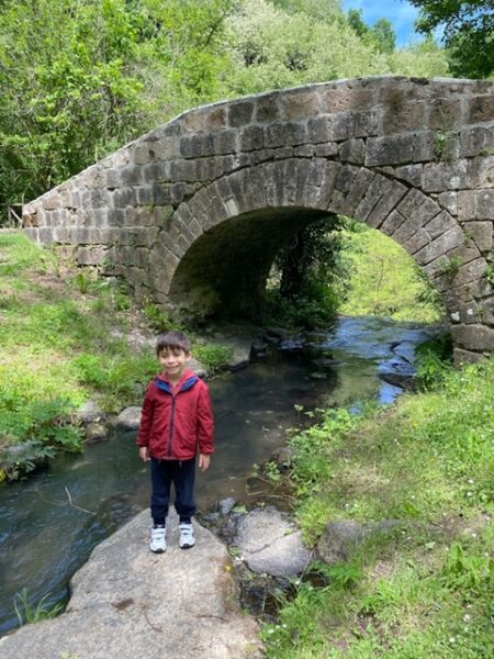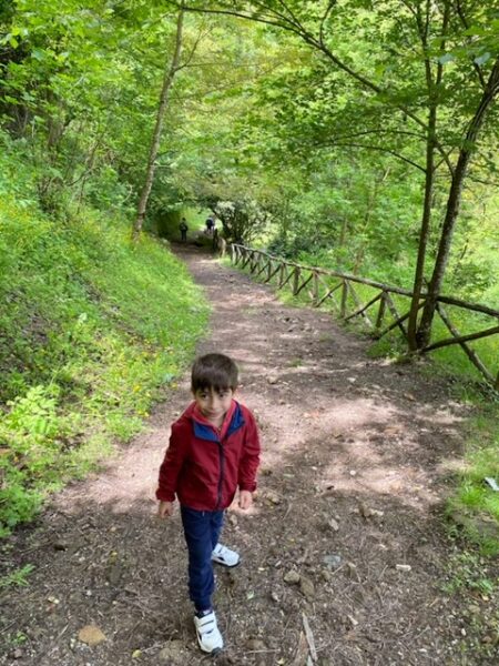 Oltrepassato questo arco, inizia un sentiero in discesa. Non è ripidissimo ma comunque vi consiglio di indossare scarpe che non abbiano la suola liscia, perché se il terreno è bagnato o umido , potreste scivolare. Inoltre il percorso non è fattibile col passeggino, perciò se avete bambini piccoli, vi consiglio l’uso del marsupio. In primavera la vegetazione è particolarmente fitta, attraversiamo una foresta fatta di felci fino ad arrivare al ponte in pietra , sotto il quale scorre il Rivo Conca. Manuel si è fermato sulle rocce e subito ha adocchiato dei piccolissimi girini e insetti pattinatori (ah, gli insetti sono una sua grande passione e quando facciamo queste passeggiate, deve scovarne il più possibile!). Superato il ponte, troverete un’area con alcuni tavoli e panche in legno. Non vi aspettate un’area attrezzata, ma giusto un appoggio per fare la vostra merenda o un picnic veloce. Noi ci siamo fermati qui per rifocillarci con la nostra colazione al sacco prima di riprendere la discesa verso la cascata.