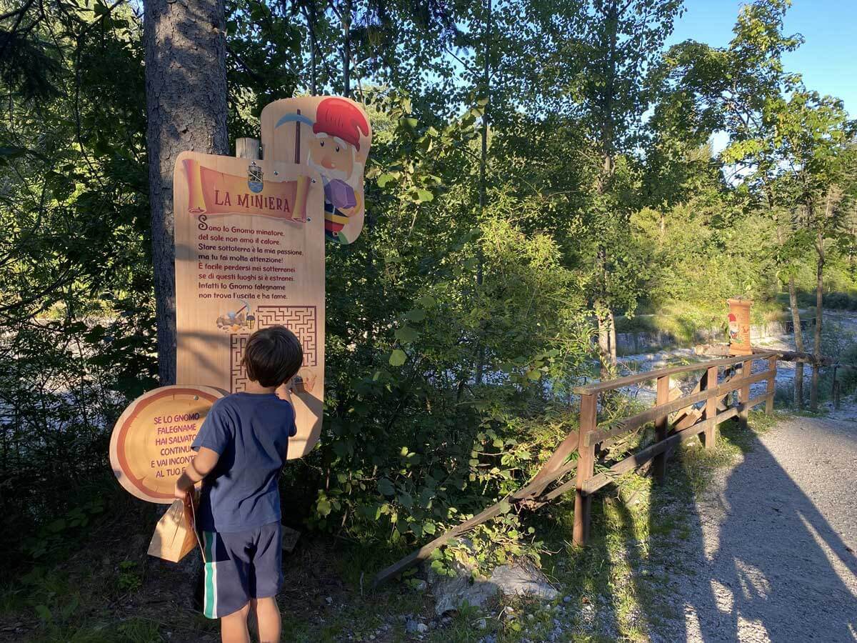Il percorso racconta tante piccole curiosità degli gnomi che vivono in questi posti e invita a una piccola caccia al tesoro per portare alla fine del sentiero vari oggetti: qualcosa di rotondo, qualcosa che puzza, qualcosa di liscio, qualcosa da buttare (nei bidoni della spazzatura che troverete in fondo) etc.