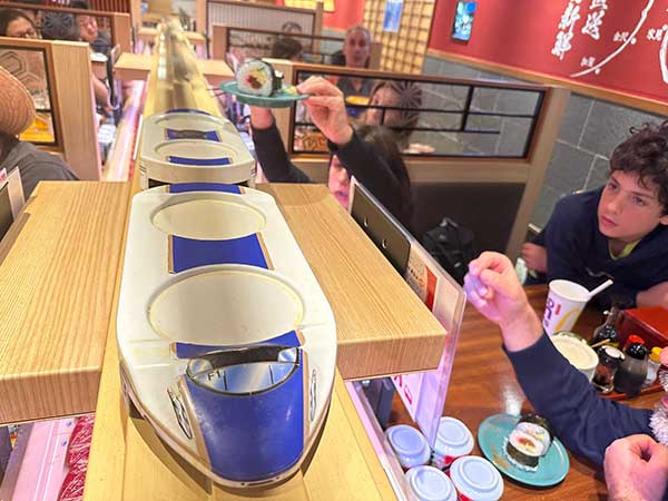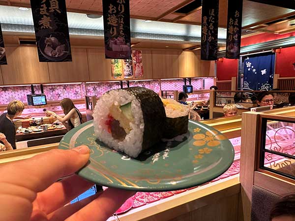 Noi dopo diversi giri e un ristorante consigliato dalle guide, ma scartato perché ingiustificatamente caro ci siamo fermati da MoriMori. C’è un po’ di attesa ma sono ben organizzati, i piattini idi sushi arrivano su un trenino che viaggia su un binario e il conto si paga contando i piattini rimasti sul tavolo.