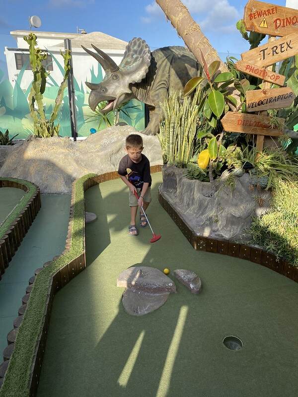 Dopo un secondo giorno cosi intenso, siamo tornati al nostro appartamento per riposarci un pó e per il tardo pomeriggio abbiamo deciso di raggiungere Puerto del Carmen , a sud dell’isola, perché avevo promesso a Manuel di portarlo al minigolf Jurassic Kingdom. Ebbene, anche se amiamo stare lontano da calca e confusione ed evitiamo le cose più turistiche, come potevo non portare un bambino amante dei dinosauri a fare una partita a minigolf a tema giurassico??