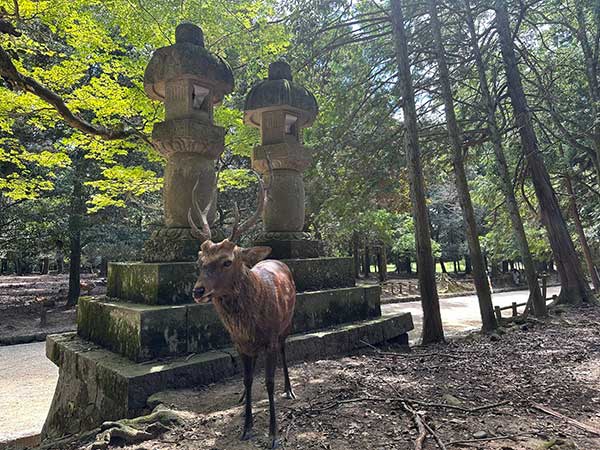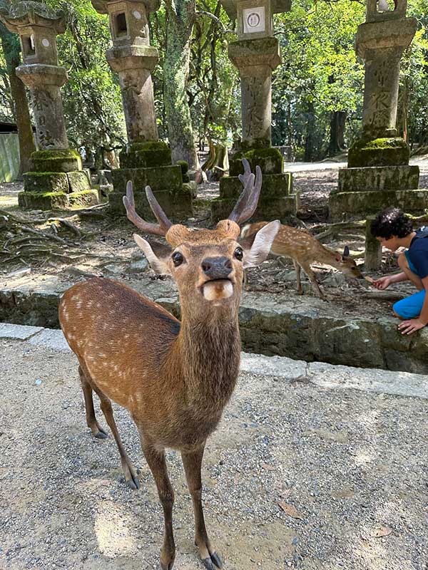 I cervi passeggiano tranquilli anche tra i negozietti, ma vi consigliamo di addentrarvi nel parco, comprare un pezzo di biscotti a 200 yen (è vietato dare cibo diverso ai cerco) e godervi una passeggiata indimenticabile.