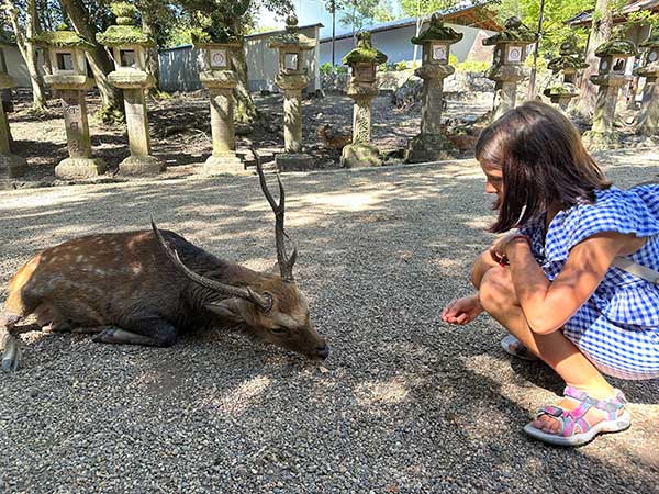 Nara è piccola e si gira tutta a piedi, per la nostra esperienza basta mezza giornata per vederla, soprattutto con i bambini ( a cui più di uno o due templi alla giornata non si può chiedere di vedere) e vi consigliamo di iniziare la giornata presto per vedere il tempio Fushimi Inari ( se arrivate entro le otto vi potete godere la magia del tempo senza troppi turisti) e poi proprio dalla stazione della metro di Fushimi Inari prendere il treno diretto per Nara.se siete fortunati ( non abbiamo capito se ci sono degli orari precisi) potrete prendere anche un treno con i cervi.