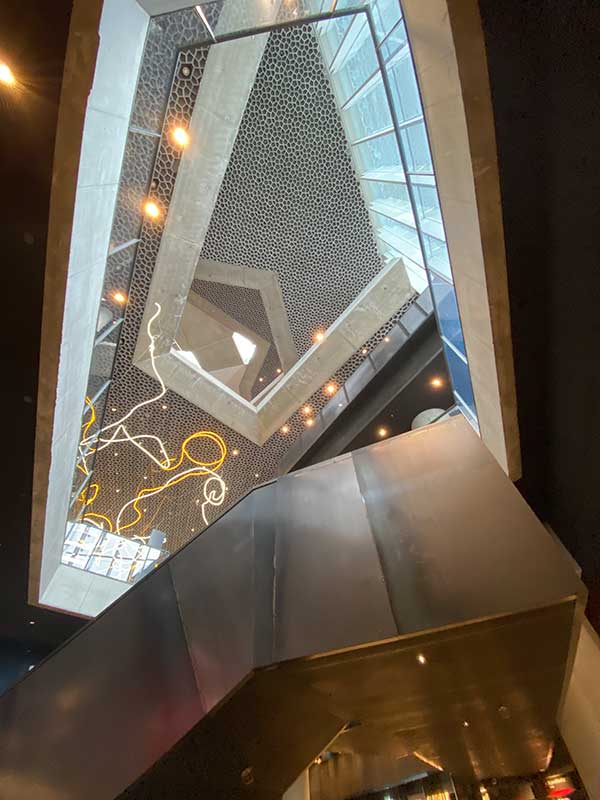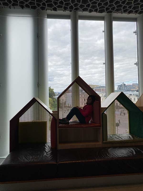 La biblioteca si sviluppa su sei piani e sporge per più di 20 metri sopra la piazza e offre una vista a strapiombo e mozzafiato sul fiordo di Oslo.