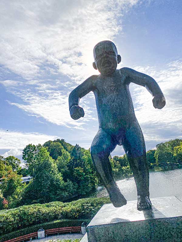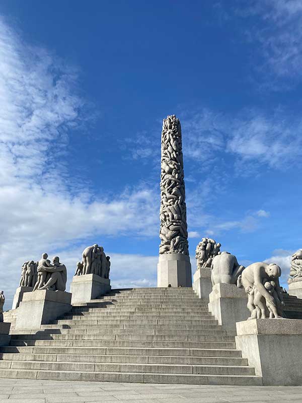 Dopo la visita al museo del Folclore, noi abbiamo a malincuore rinunciato a vedere gli altri musei ( che pur ci tentavano) abbiamo ripreso l’autobus e in un quarto d’ora siamo arrivati al Parco Vigeland. Confessiamo che la nostra meta era il grande museo all’aperto con le 200 sculture in bronzo, granito e ferro battuto dello scultore Gustav Vigeland, ma la vera grande attrazione per i bambini è stato il grande parco giochi.