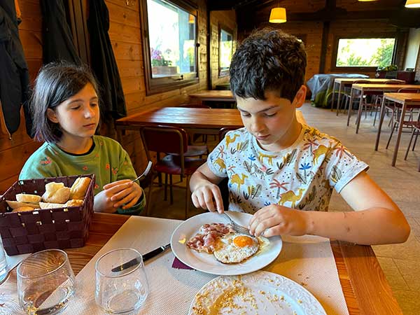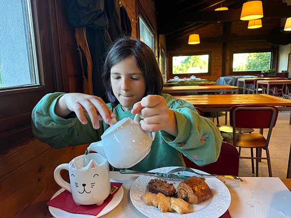 E la mattina dopo un dolce risveglio al canto degli uccellini vi aspetta una colazione da sogno, per i bimbi tazze a gattino, biscotti fatti in casa e torte, per i genitori enormi tazze di caffè, tè e cappuccino e ogni bontà che possiate immaginare dolce e salata.