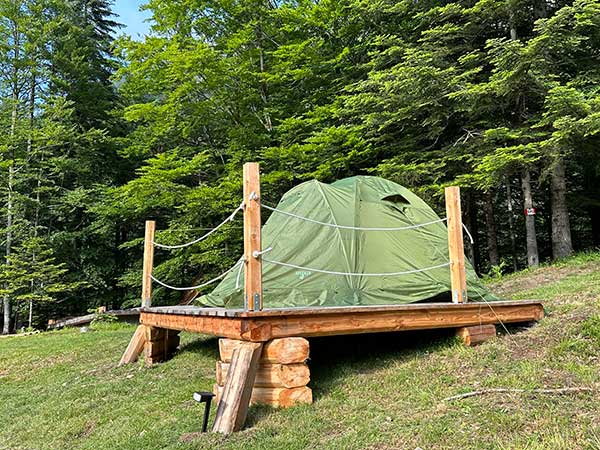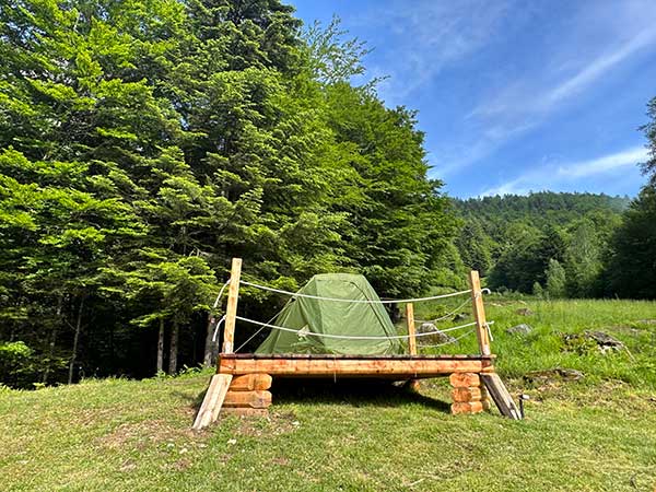 E la tenda non si trova sul terreno, quindi niente radici o pendenze, ma è montata su una piattaforma di legno, che la isola dal terreno e permette di dormire su un piano perfetto.