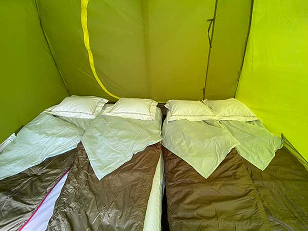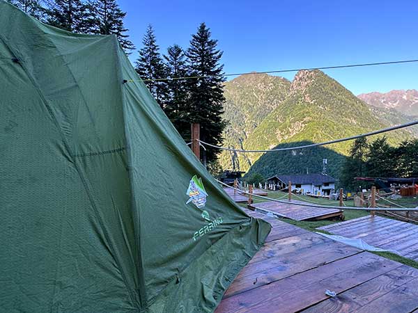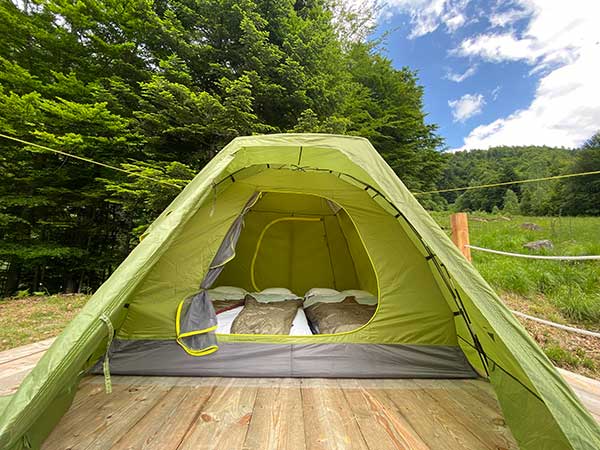 Le tende sono Ferrino e dentro si può stare in piedi. C’è anche una verandina per scarpe e bagagli.