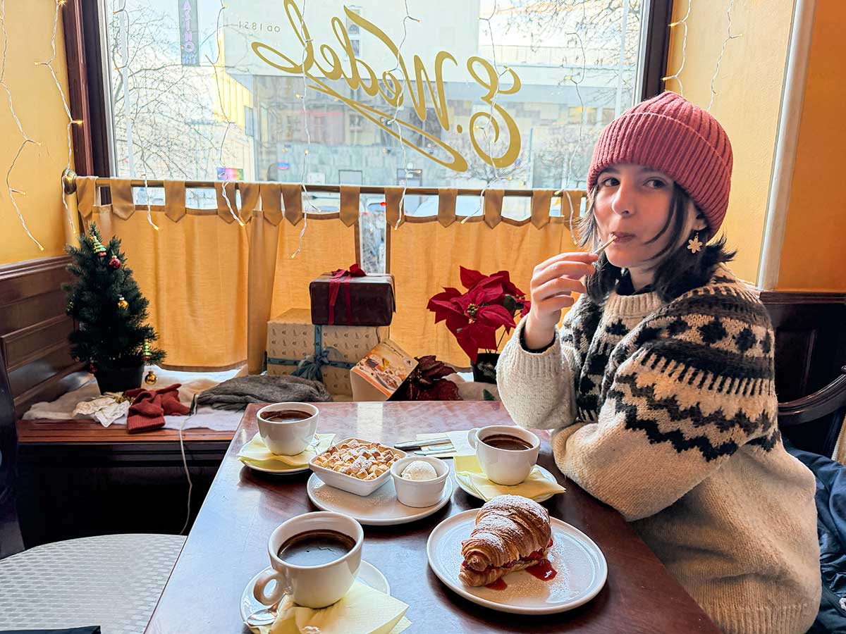 La specialità è ovviamente la cioccolata calda, famosa per essere molto densa e intensa. Attenzione alle misure: la tazza piccola corrisponde più o meno alla nostra cioccolata “standard”, quindi meglio non esagerare con le quantità.