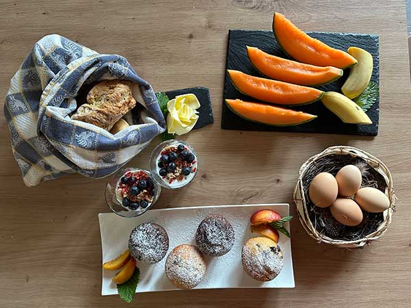Prima colazione, cestino per la colazione, serate con assaggio di dolci tipici (Strauben), corso di cucina “preparare canederli)”, preparare il pane (su richiesta), possibilità di avere prodotti dall’orto, possibilità di collaborare al maso, visita guidata al maso, fuoco di bivacco, consegna pane fresco