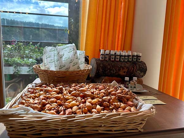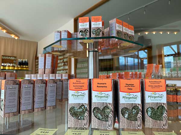 Il punto vendita al maso è aperto tutto l’anno. Potete comprare tisane, condimenti ,semi, olii, sacchetti e cuscini profumati. Noi abbiamo comprato la tisana delle strege e quella del buon umore.