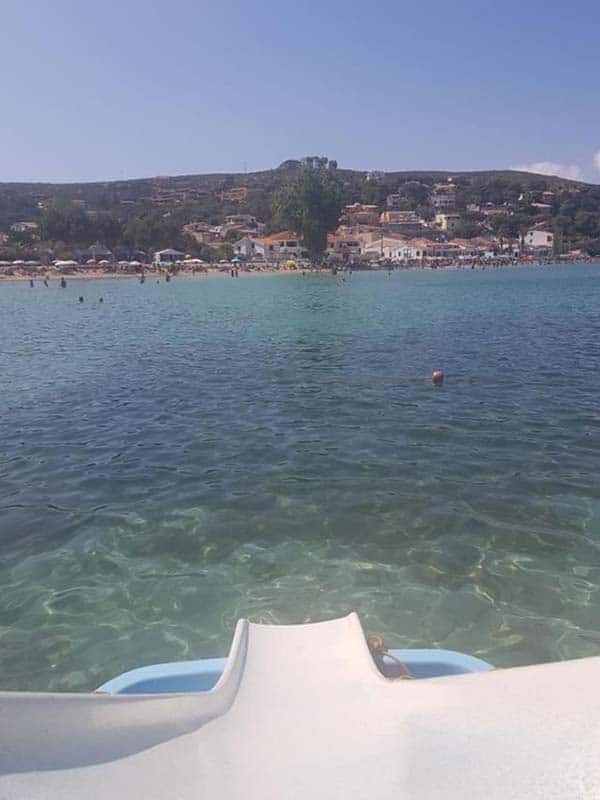 Rigenerati dal bagnetto proseguiamo e arriviamo a Maladroxia…la spiaggia è grande e dotata di molti più servizi e di bagni, e nello stabilimento è possibile mangiare, noleggiare ombrelloni e pedalò…noi l ‘abbiamo preso per mezz’ora al costo di 10 euro…è stato bellissimo scivolare anche se l’acqua era fredda.