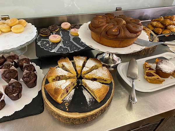 A colazione, grandissima scelta, latte senza lattosio e tantissime crostate e dolci freschi, come la buonissima torta di rose.