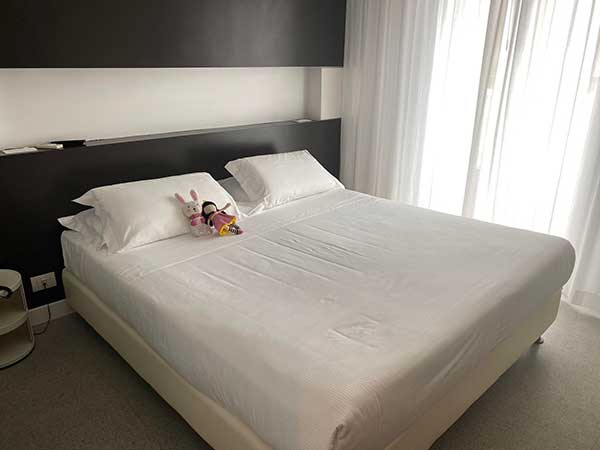 Le camere sono ampie, ci sono triple e quadruple, con arredamento moderno materasso e cuscini comodi. Grande pulizia. Spondine per i letti e cullette.