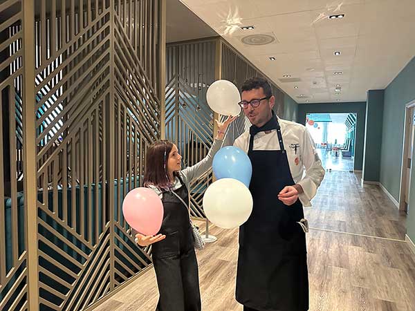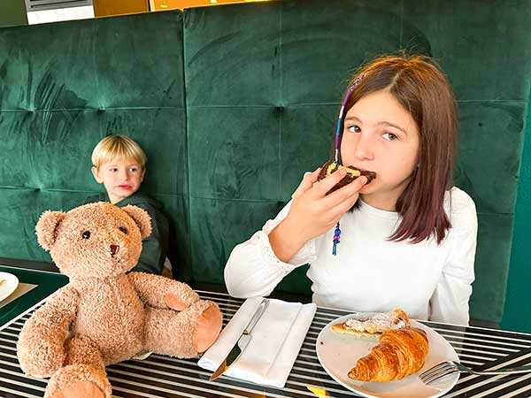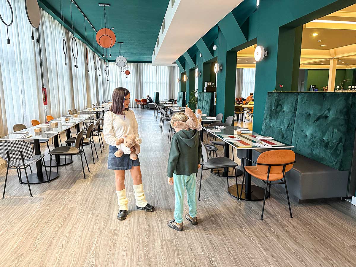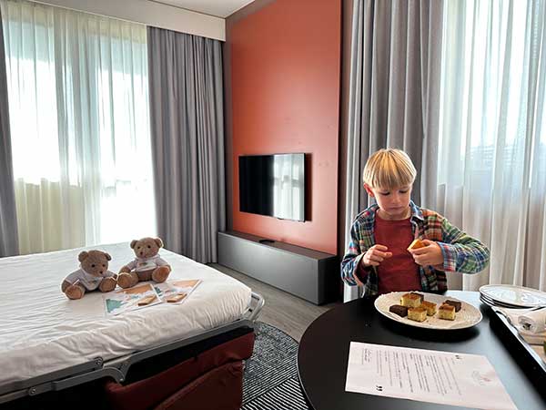 Ciò che ci ha piacevolmente colpito è stata l’accoglienza riservata ai bambini: appena giunti in camera abbiamo trovato ad attenderci: una selezione di dolci fatti in casa, frutta fresca, bevande e una tenera mascotte di peluche, Quarky, da cui non si sono più separati. Inoltre era presente una busta per ciascun bambino con giochi e schede da colorare, utile anche per intrattenerli al ristorante.