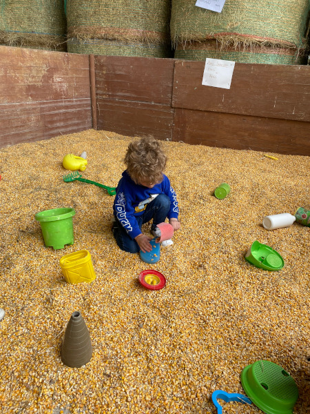 Mattia ha, poi, cavalcato un pony, partecipato ad un breve tour con il trattore e giocato liberamente nelle diverse aree della fattoria, facendo travasi di mais, lanciandosi nel fieno e provando tutti i giochi che si facevano una volta.