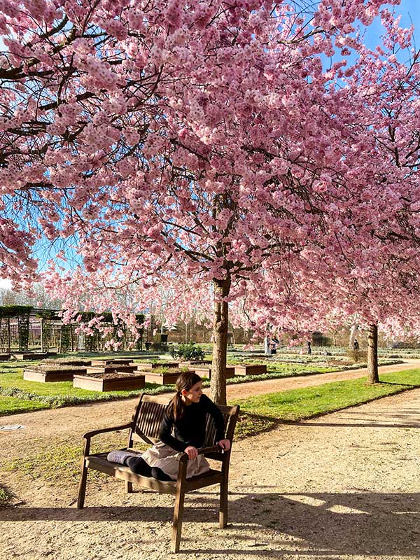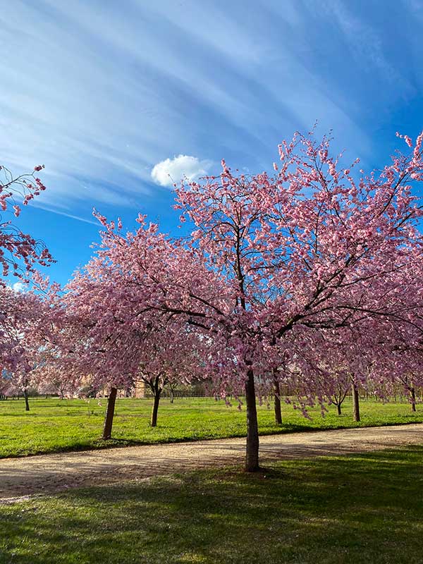 Nei giardini della reggia di Venaria Reale ci sono due viali di ciliegi, in uno mettono anche le panchine di legno per sedersi e, naso all’insù, ammirare i petali di ciliegio in fiore, riflettendo sulla bellezza e la fragilità della vita, che proprio come i piccoli petali di ciliegio ( “Sakura” , in giapponese) che inevitabilmente cadono a terra e muoiono, anche se il loro volo è poesia assoluta.. Ci sono anche due bellissimi ciliegi vicino al giardino con le statue di Penone.