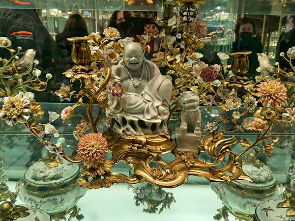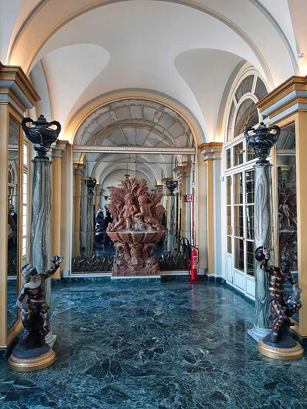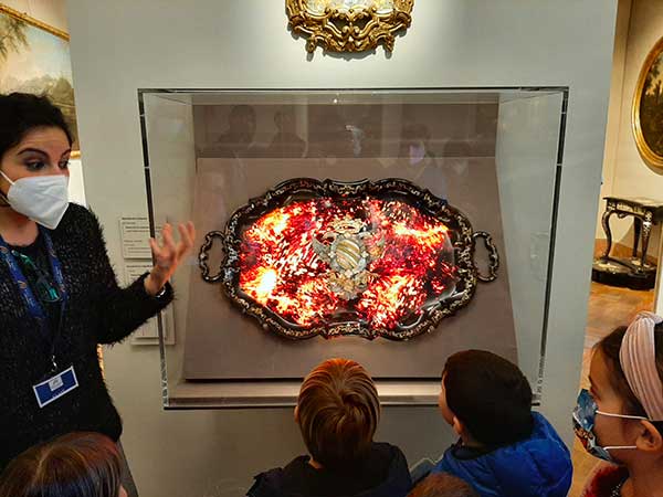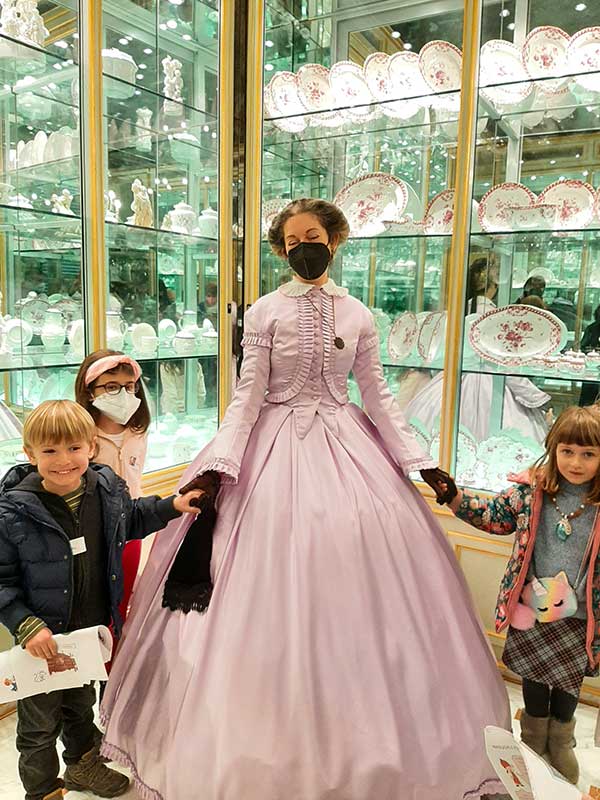 Siamo immersi in una serie di sale a vetrine che contengono soprammobili e oggetti in cristallo di ogni foggia e forma, ai bambini viene chiesto di cercarne alcuni e viene spiegato loro il significato del loro utilizzo, nelle sale successive è tutto un susseguirsi di meraviglie: dalle porcellane al rame delle 380 pentole della cucina, dalla madreperla degli intarsi al guscio di tartaruga utilizzato per la costruzione di un vassoio capace di “incendiarsi” se opportunamente illuminato. Bambini e adulti sono a bocca aperta di fronte a queste eccellenze artigianali, catapultati indietro di secoli ci aggiriamo quasi storditi tra tanta bellezza e siamo anche così fortunati da incontrare alcuni nobili in costume pronti per una rappresentazione teatrale con cui ci fermiamo a scattare alcune fotografie.