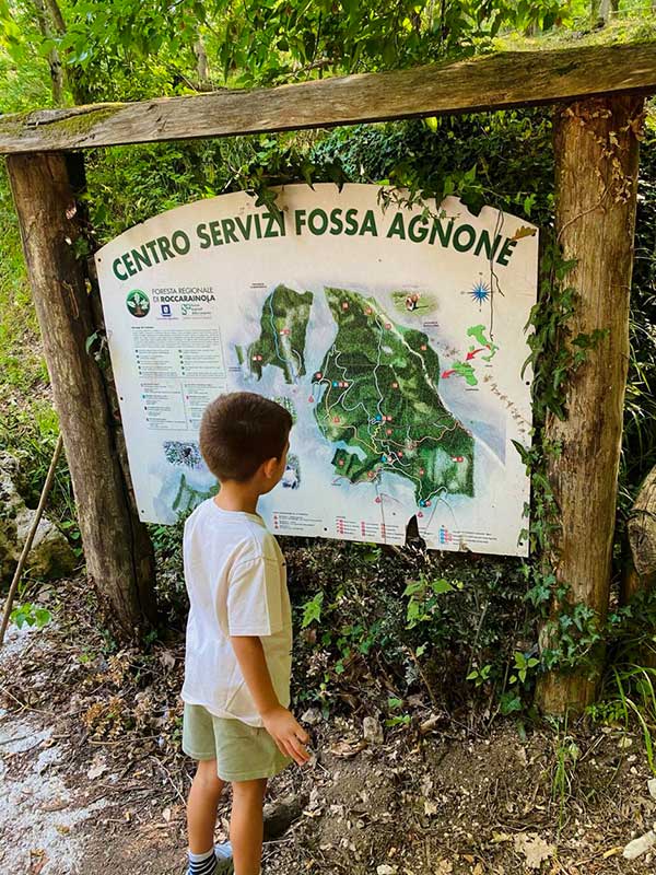 Dall’ingresso principale di Fossa Agnone, abbiamo percorso il Sentiero Botanico, lungo circa 3 km fino al Vivaio Grande , di facile percorribilità (no passeggini), lungo il quale abbiamo potuto ammirare non solo la bellissima vegetazione che crea degli scenari veramente fiabeschi, soprattutto dove il sole quasi non riesce a penetrare, ma abbiamo anche imparato a guardare con occhi diversi ciò che incontravamo sul nostro cammino.