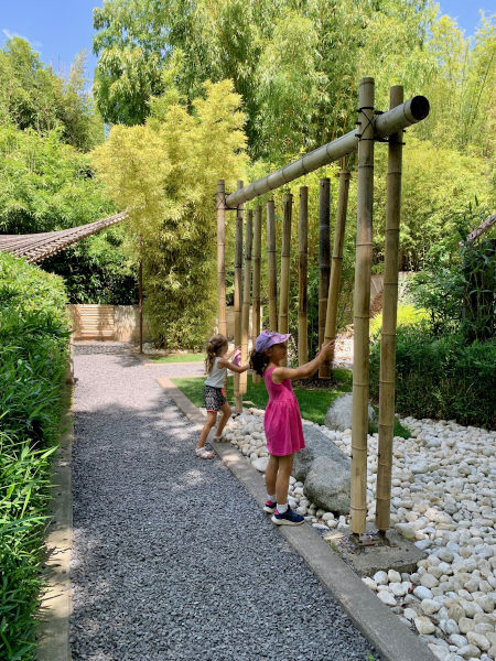 Non ci resta che esplorare l’ultima zona, i boschi del Mondo, dove troviamo anche refrigerio. Il suggestivo Bosco di Bambù ti catapulta direttamente dall’altra parte del Mondo, così come la serra di piante e farfalle tropicali. Il percorso è molto piacevole, accompagnato da corsi d’acqua e imponenti alberi. Arriviamo al Giardino Giapponese dove ci togliamo immediatamente le scarpe per camminare a piedi nudi nel torrente. Dopo un momento di totale relax proseguiamo per raggiungere la bellissima Spiaggia delle Palme, sedie sdraio posizionate su sabbia bianca con vista sulle montagne. Si può chiedere di più?