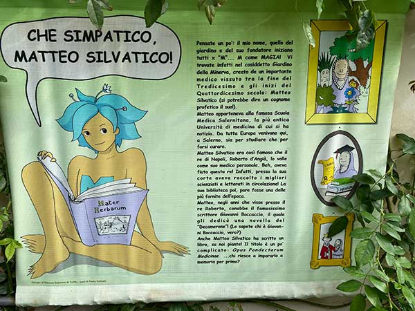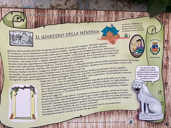 Il giardino fu fondato da Matteo Silvatico, tra la fine del XIII e gli inizi del XIV secolo. Matteo apparteneva alla famosa Scuola medica Salernitana, la più antica Università di Medicina di cui si ha notizia. A Salerno arrivavano giovani medici per studiare da tutta Europa. E Matteo Silvatico era così famoso che il re di Napoli , Roberto d’Angiò, lo volle  come suo medico personale e a Salerno creò questo giardino meraviglioso, il primo in Europa, per lo studio di piante a uso terapeutico.