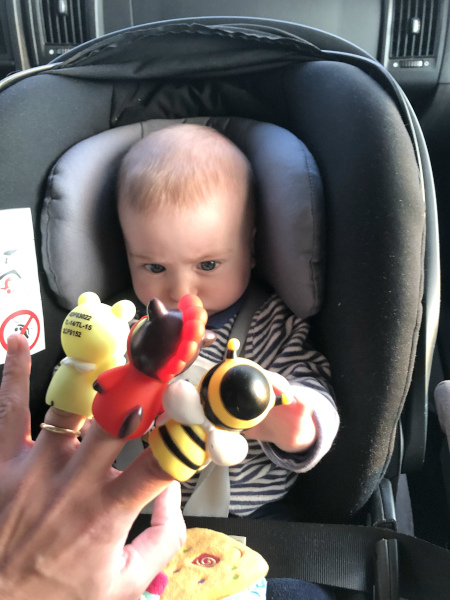 Ma cosa fanno durante il viaggio? Di solito dormono, almeno per gran parte del tempo. Per il resto puoi intrattenerli con i giochini di casa, magari i loro preferiti, da appendere alla maniglia dell’ovetto o agganciandoli al seggiolino.