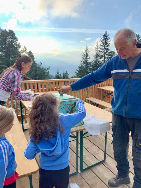 Siamo scesi in malga accompagnati dal magico suono dei campanacci e assistito alla mungitura. Le piccole in compagnia di Stefan, con un po’ di timore, hanno provato a mungere una mucca. Nel frattempo che Ivana e i suoi bimbi Erik, Elia ed Emil mostravano gli altri animali della malga alla bambine ci siamo concessi un aperitivo con un maxi tagliere di affettati e formaggi. A dir poco strepitoso!