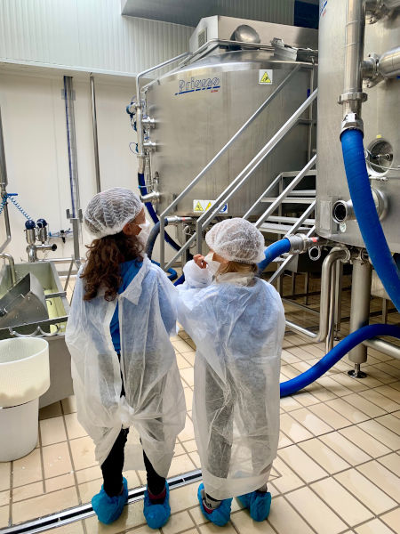 Ora che abbiamo capito il perché dalle bontà e qualità del latte trentino siamo curiosi di scoprire come viene trasformato in formaggio. Accompagnati dal casaro Michele del Caseificio di Pera di Fassa entriamo del loro laboratorio. Il latte viene messo in una grande vasca polivalente dove insieme al caglio viene cotto. Le bimbe hanno avuto la fortuna di sbirciare in questo grande “pentolone” e scoprire che il latte non era più liquido. Il composto viene poi scaricato nella vasca di pressatura dove riposa e rilascia il siero. A questo punto la pasta viene tagliata e posizionata nella fasciera per dare la forma circolare al formaggio. Infine lasciata riposare per l’intera giornata sotto presse meccaniche per facilitare la fuoriuscita del siero.