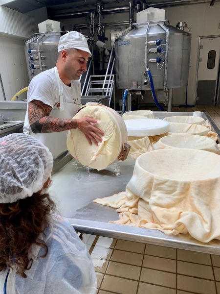 Il formaggio viene tolto dalla fasciera e portato in vasche di sale e acqua dove riposa ulteriormente. Infine abbiamo visitato la sala più incredibile, quella dove vengono posti tutti i formaggi a maturare. Si è colti da un forte odore pungente ma ben sopportato anche dalle bimbe e ci si perde in queste lunghe e alte file di formaggi. Se sei amante dei formaggi come noi questo è il paradiso!